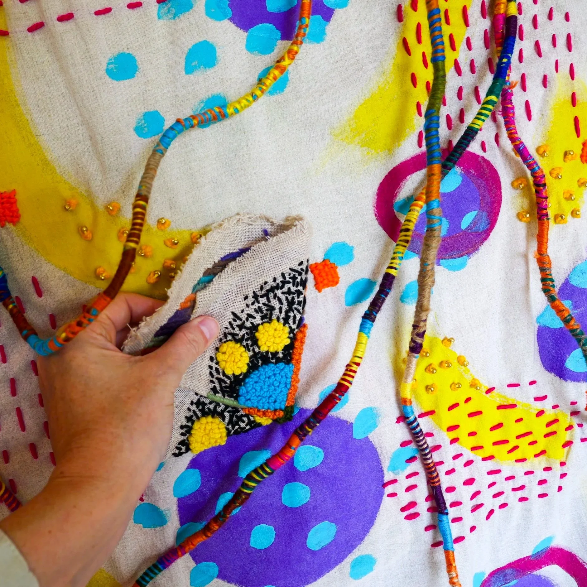 This then led to some bead application; gold beads being sewn into the yellow french knots. With more beads to be applied at as the days progress. And only now can I start to see the light at the end of the tunnel. By the way, I don’t actually know what it will look like and what it will evolve into, but I feel confident in the process of playing with the piece to work that out.