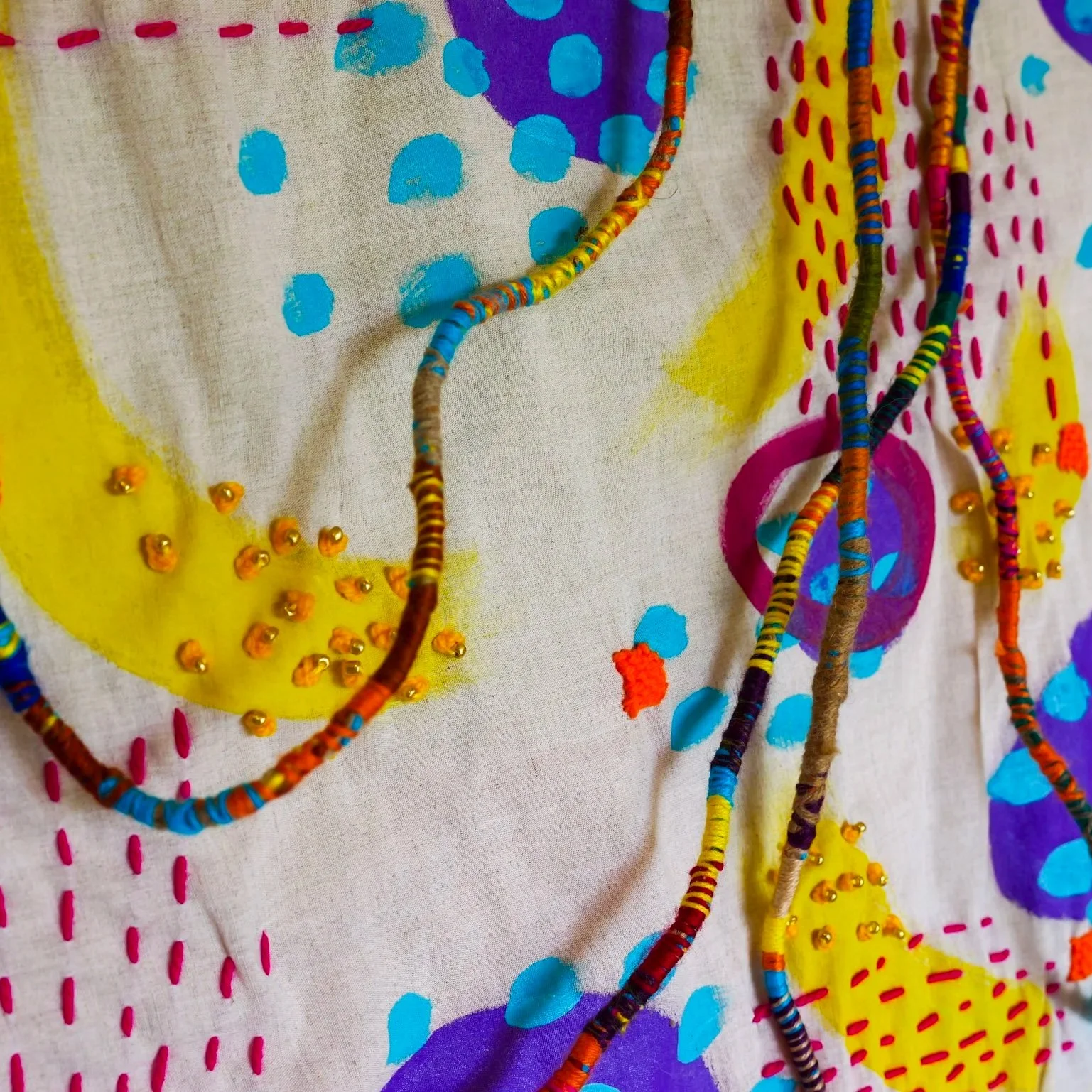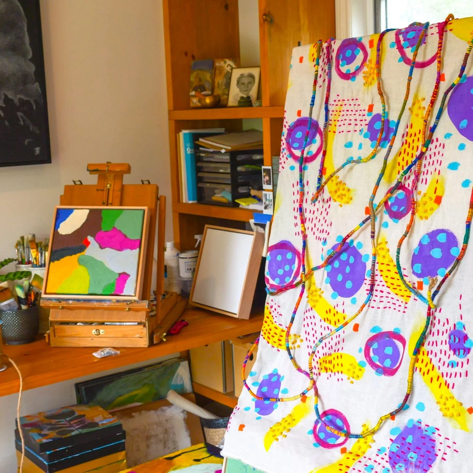 I work through making things in response to colour, shapes, texture and feelings. When I walk throughout the day I’m constantly making a mental note of how a colour appeared, the shape it held in contrast to another, how it felt to touch it and how it made me feel. When I paint or make something, these reference points often come back to me.